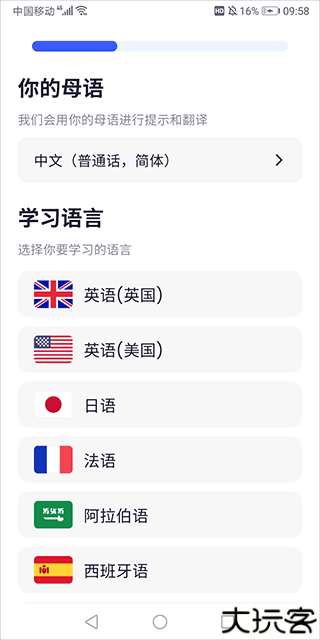 登录账号后挑选英美、法语或日语开始学习。