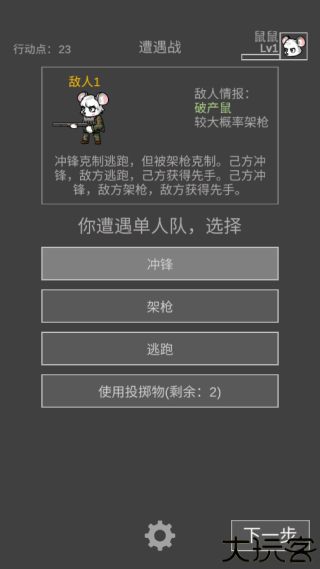 老鼠大冒险手游是文字版的策略逃离游戏,玩法是单机策略模式。每次战斗前,玩家都可以准备好带的装备和补给品。每样东西的选择不只是会影响战斗结果,还会直接影响资源管理,毕竟每件装备都有消耗。在老鼠大冒险手游里,玩家是名策略家,会进入三张不一样的地图,每局都是2V2的对战形式。玩家要根据指引去寻找高价值的物品。遇到敌人时,可以选择冲锋、架或逃跑。