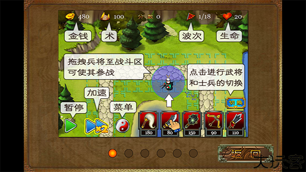 1、左下角是暂停、加速和菜单,上方是一些道具栏,例如金钱和术,右上角是敌人的波次和剩余的生命。