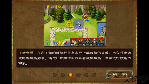 3、技能查看:在右下角的武将栏里点击已上场武将的头像,可以呼出该武将的技能列表,通过此项操作可以查看武将技能,也可进行技能的释放。