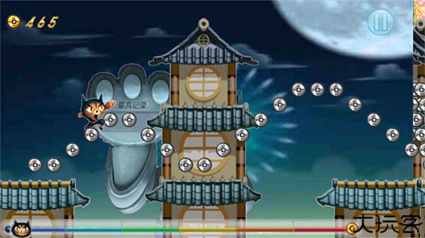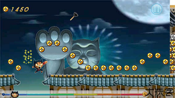 飞天忍者猫手机安卓版,英文名为Cat Ninja Fly,又名为Temple Cat Run,采用忍者和猫咪为主要题材的休闲动作类跑酷游戏,游戏以高速奔跑与高难度操作为核心玩法,极大考验玩家的反应与手速。飞天忍者猫手机安卓版下载完成后,忍者猫的奔跑速度极快,玩家需灵活跳跃并收集金币,准确投掷马桶绳索以越过深坑。一旦玩家使忍者喵跳跃失误或忘记使用绳索,忍者猫将掉落至万丈深渊。