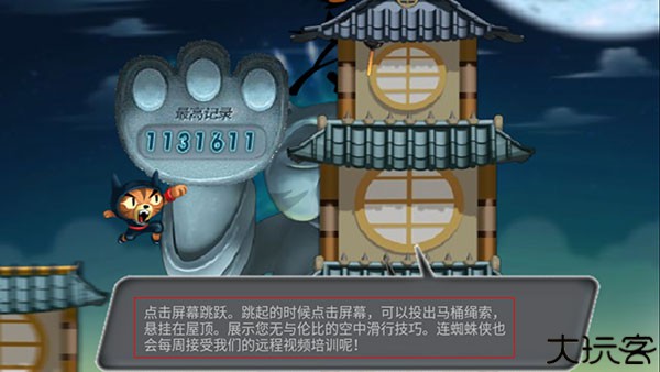 2、开始时有新手介绍,点击屏幕即可跳跃,跳起的时候再点击屏幕,可以投出马桶绳索。