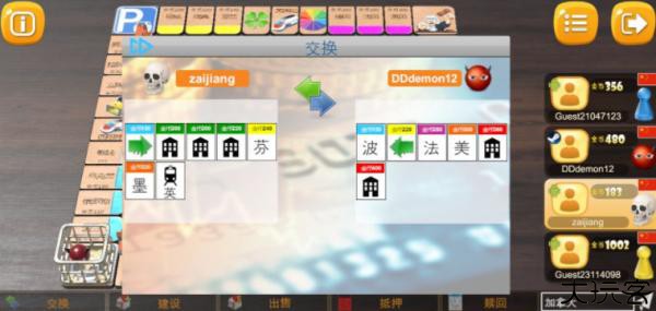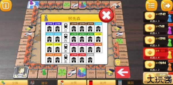 2、当玩家有了足够资本后,就可以购买和卖掉地产,以便自己能吞并其它玩家的资产,也可以直接购买其它玩家的资产。