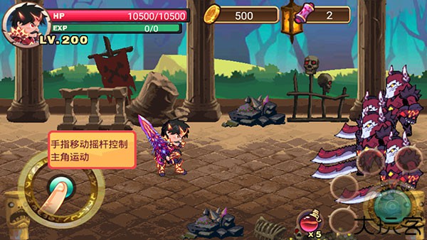 1、使用屏幕左侧摇杆操控角色走位,灵活穿梭于战场之中。