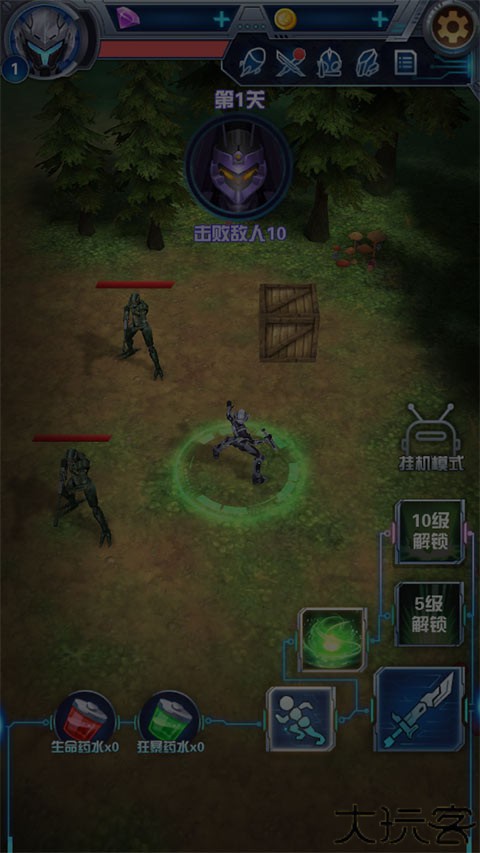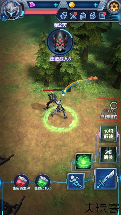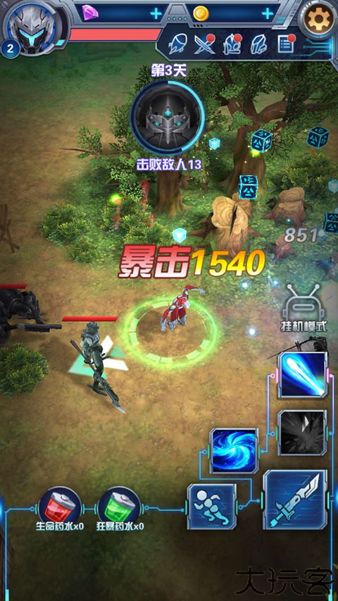 2、合理使用技能按钮可迅速提高战斗表现,击退强敌。