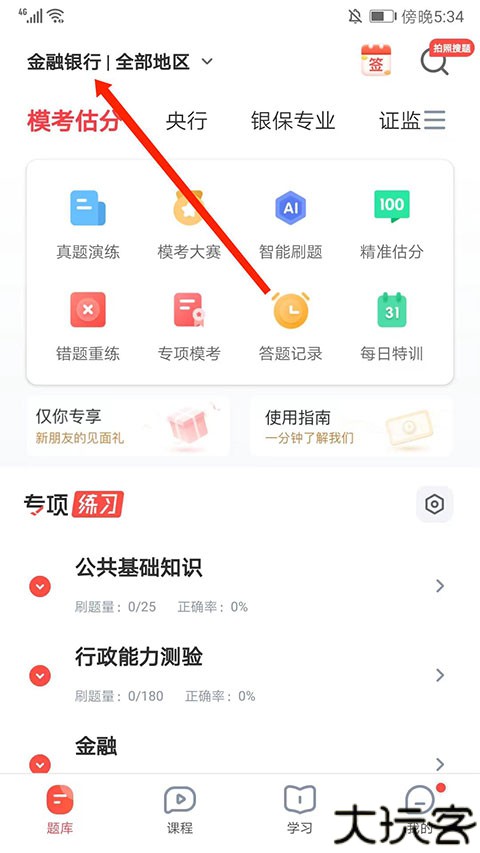 打开软件首页,点击左上角“考试目标/报考地区”。