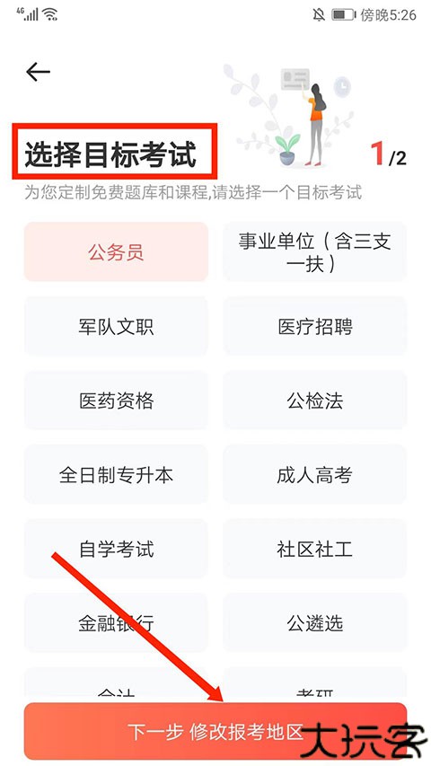 在弹窗中勾选考试类型,点击“下一步”进行地区选择。