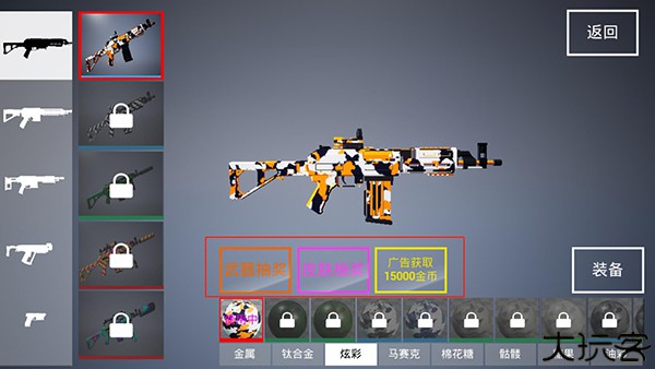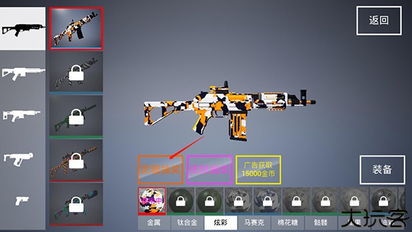 2、玩家可以通过武器抽奖、皮肤抽奖或者是广告获取15000金币等方式来陆续解锁武器。