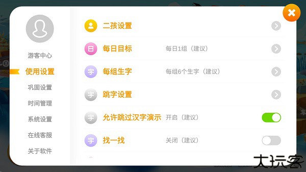 2、在使用设置中可以设置二孩模式、每日目标、每组生字、跳字设置等。