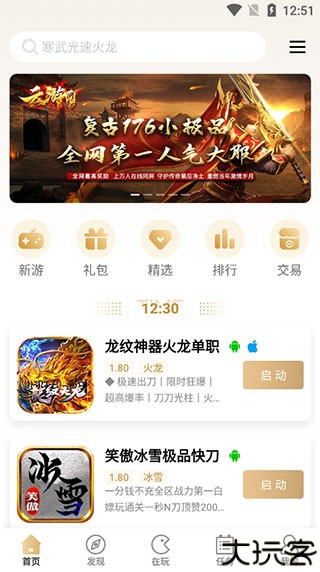 首页可浏览榜单、礼包、精品推荐及交易板块内容。