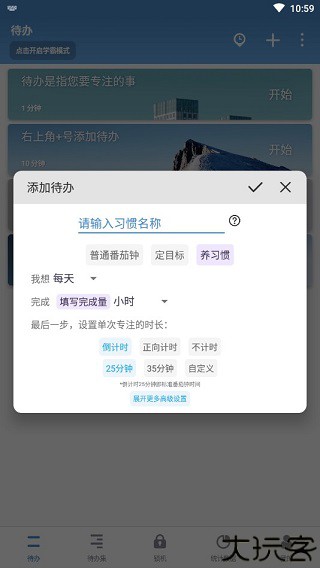 4、选择番茄钟、定目标、养习惯三种模式,完成你的自律挑战。