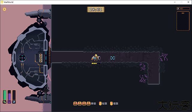 使用鼠标左键开凿矿壁,右键则吸收矿石入背包。