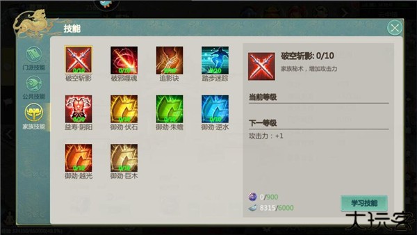 4、当玩家获取奖励后还可以在技能坊学习和提升自己的家族技能。