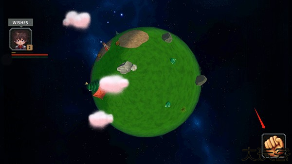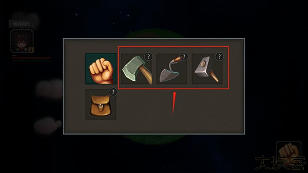 4、想要制造更多有用的工具,玩家需要去采集需要的资源,而有些资源需要对应的工具才可采集,比如锤子采集石头,斧子采集木材等等,这些工具都可以制造出来,首先点击星球上的帐篷。
