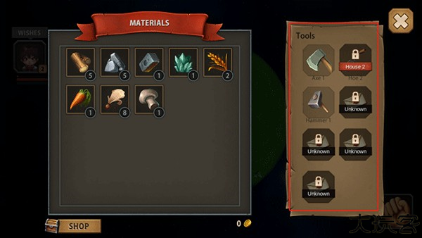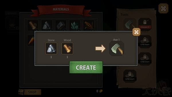逐步解锁各种物品和材料,通过组合它们打造车间,获得新工具和制作材料,如面料、玻璃瓶、金属等。逐渐,玩家的家园将从帐篷变成一座完备的房屋,拥有锻造设施、厨房和实验室等功能。