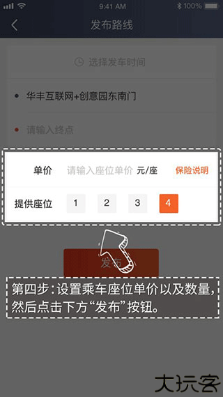 4、设置乘客座位单价以及数量,然后点击下方“发布”按钮。