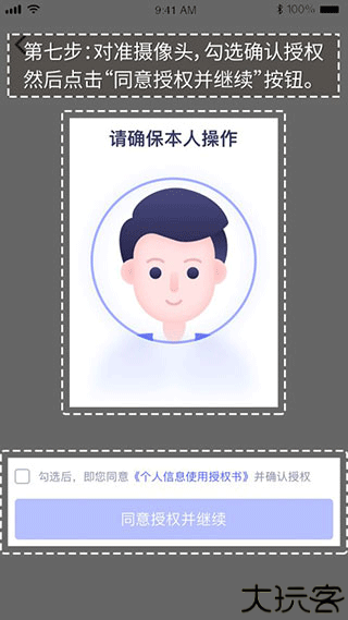 7、对准摄像头,勾选确认授权然后点击“同意授权并继续”按钮进行人脸识别。