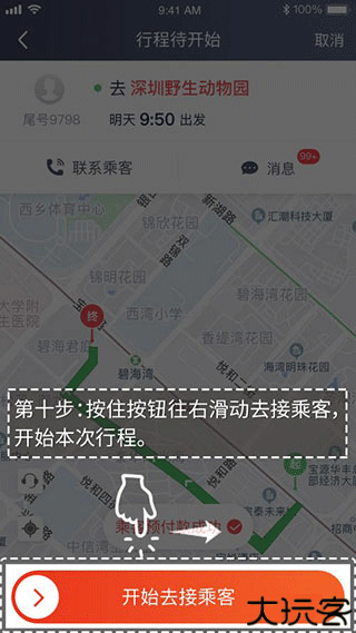 10、按住按钮往右滑动去接乘客,开始本次行程。