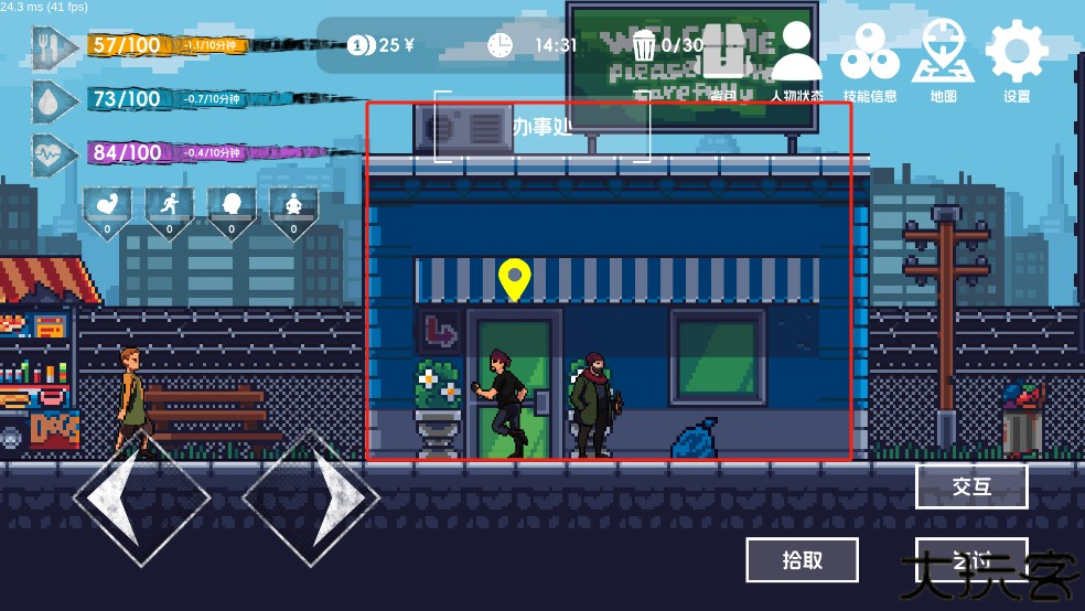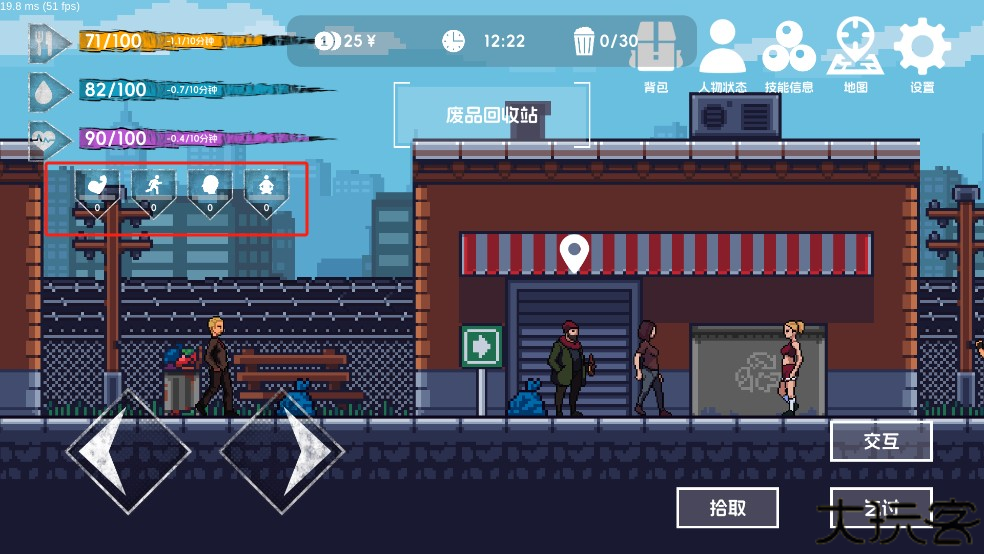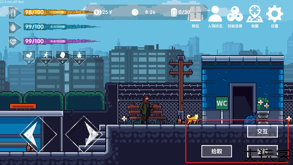 7、在进入夜晚后(21点)会消耗大量属性,如果是在户外则很有可能会在黑夜中倒下,所以请选择在收容所或者宾馆吧。