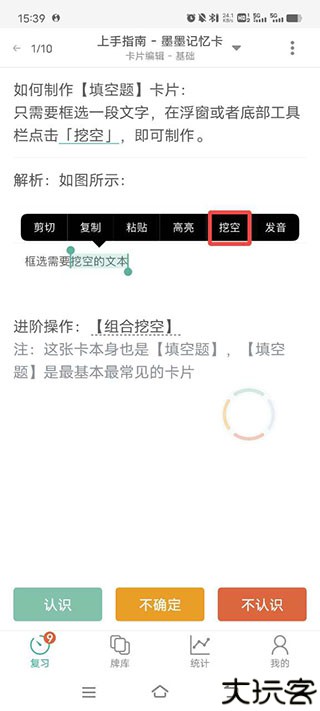 选中段落内容后点击“挖空”,自动生成缺词填空形式卡片,适用于文字类记忆。