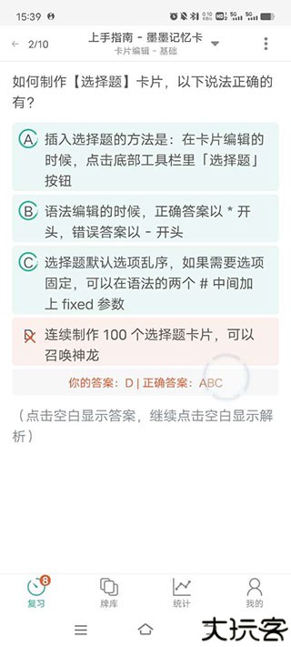 答错与答对选项会用颜色作标识,让用户快速辨识理解误区。