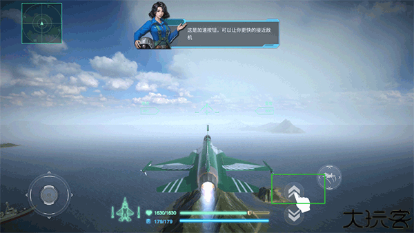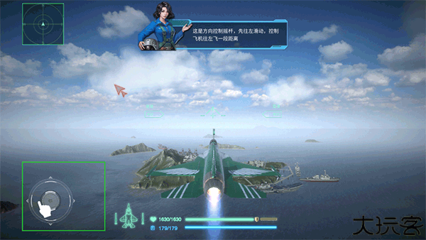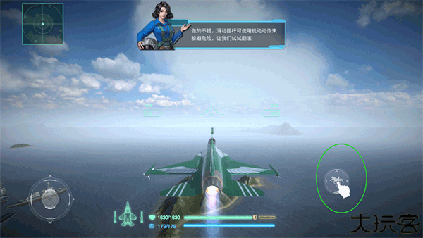2、之后玩家可以根据指引去操作机器,左下方的圆圈是控制方向的摇杆。如果摇杆往左滑动,飞机则会向左飞行一段距离。
