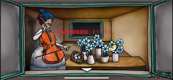 19、回到拿蓝色羽毛的房间,将照片摆上,得到手提箱密码:21314。