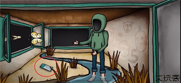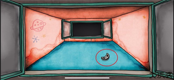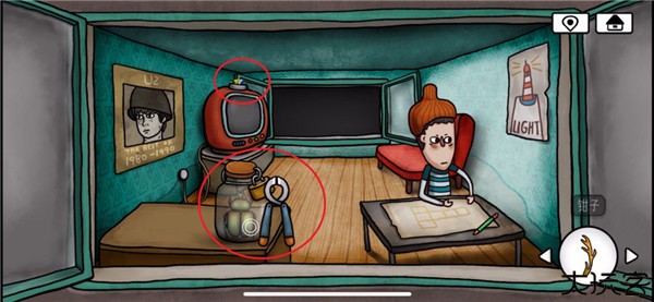 9、再次来到涂鸦小男孩的房间,用钳子打开玻璃罐,得到蜣螂,将天线按照到电视机上,电视内容提示挖出太阳符石的位置。