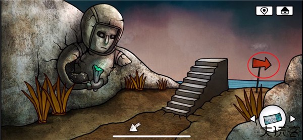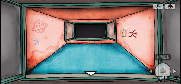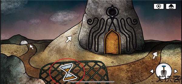 22、来到小屋左边,捡起沙漏贴纸,继续往左走,点击火箭大门。