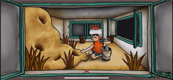 12、进入房间后,将铁桶递给小男孩,可以得到铲子,打开前面房间的窗户。