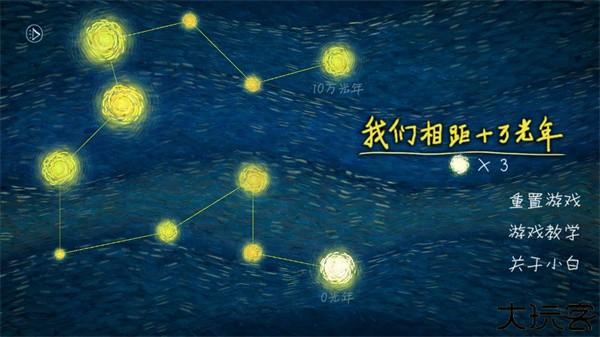 我们相距十万光年中文版,是独立创作的星空题材休闲剧情向手机游戏,游戏内容融合物理引力的游戏机制与唯美叙事的剧情表现。我们相距十万光年中文版下载完成后,玩家将在夜空中操控光线并穿梭于星星之间,通过环绕星球的周围以吸收能量,再借助引力去飞向更远处。游戏的背景音乐以钢琴旋律为主,营造出静谧而略带忧伤的氛围,伴随玩家在寂静宇宙中不断飞行、靠近、泯灭,呈现出一场充满诗意的星际旅程。
