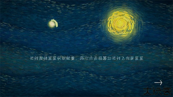1、玩家通过操控光线从一个星点跳跃到另一个星点,以便在宇宙间划出光轨。