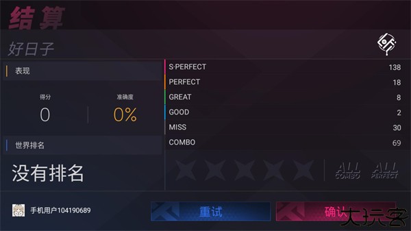 5、屏幕最上方的是歌曲进度,当进度条充满时就会结束闯关,通关后会根据玩家的分数来打出评分。