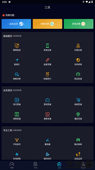 4、通过点击“工具”界面,用户可以看到边走边测、网络诊断、游戏测速等大量的功能和服务等。