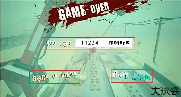 7、请一定要珍惜生命值,不管是受到僵尸攻击,还是误踩陷阱都会受到伤害,当玩家的生命值归零的时候,游戏即宣告结束。中间显示的是玩家的跑酷距离,点击左边的“BACK TO MENU”按钮会返回菜单,点击右边的“PLAY AGAIN”按钮会重新开始一局游戏。