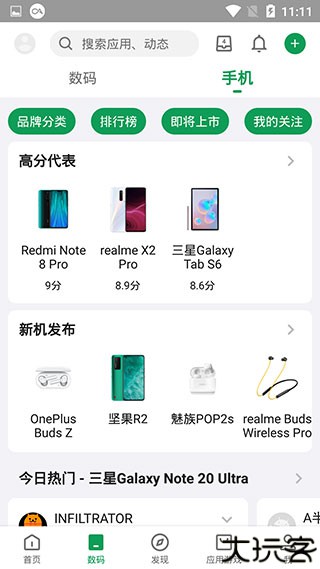 搜索支持跨模块检索,包括软件、贴文与话题等,手机专区收录热门新品及爆料。