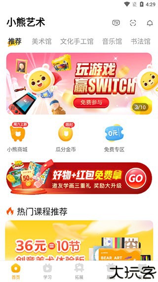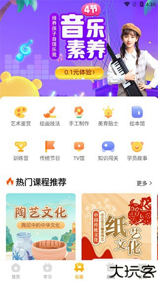 1、进入软化后,在首页中可以看到美术馆、文化手工馆、音乐馆、书法馆课程进行学习。