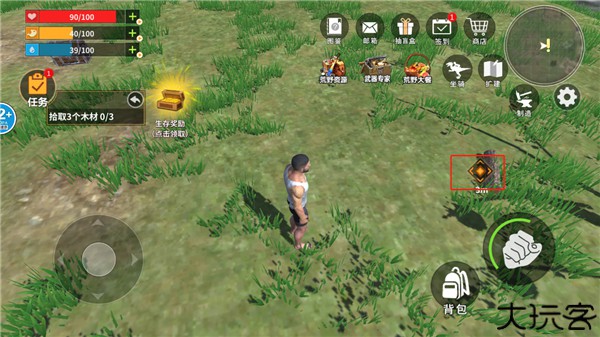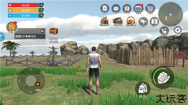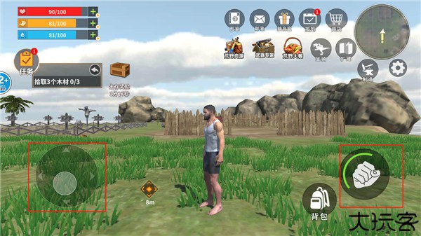 2、左侧控制行走方向,右侧按钮执行攻击或查看背包资源。