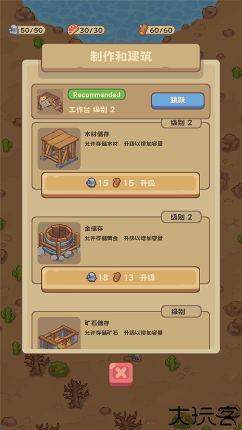 2、玩家升级采矿,以提升自己的制作和建筑技能,为构建对象进行创建和制作更复杂的资源。以各种可能的方式学习新工具并做出战略选择。