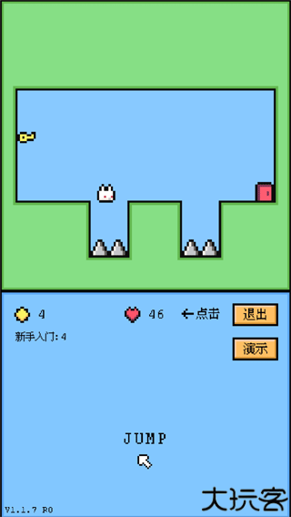 3、吃掉钥匙后,终点处的大门会自动开启,然后控制兔子跳跃避开下方的障碍物并到达门口,进入下一关。