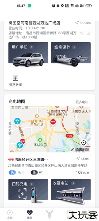 3、点开服务界面,用户可以看到车辆的维修保养,最近的汽车门店推荐以及车辆充电桩的地图。