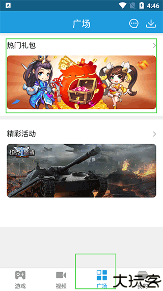 1、进入“广场”版块,点击其中的“游戏礼包”选项即可领取礼包。