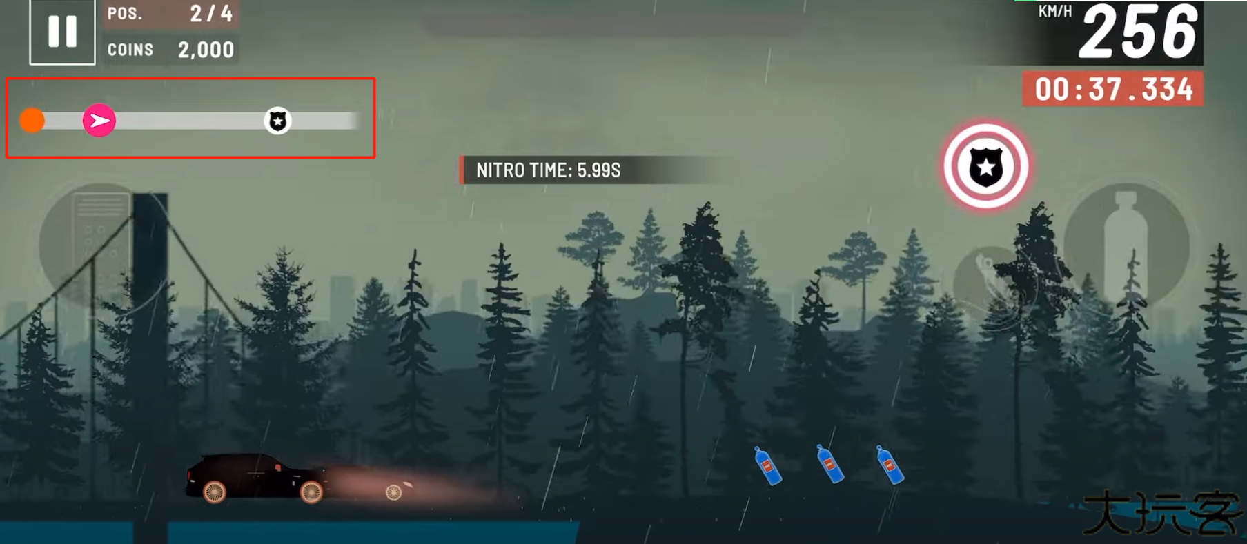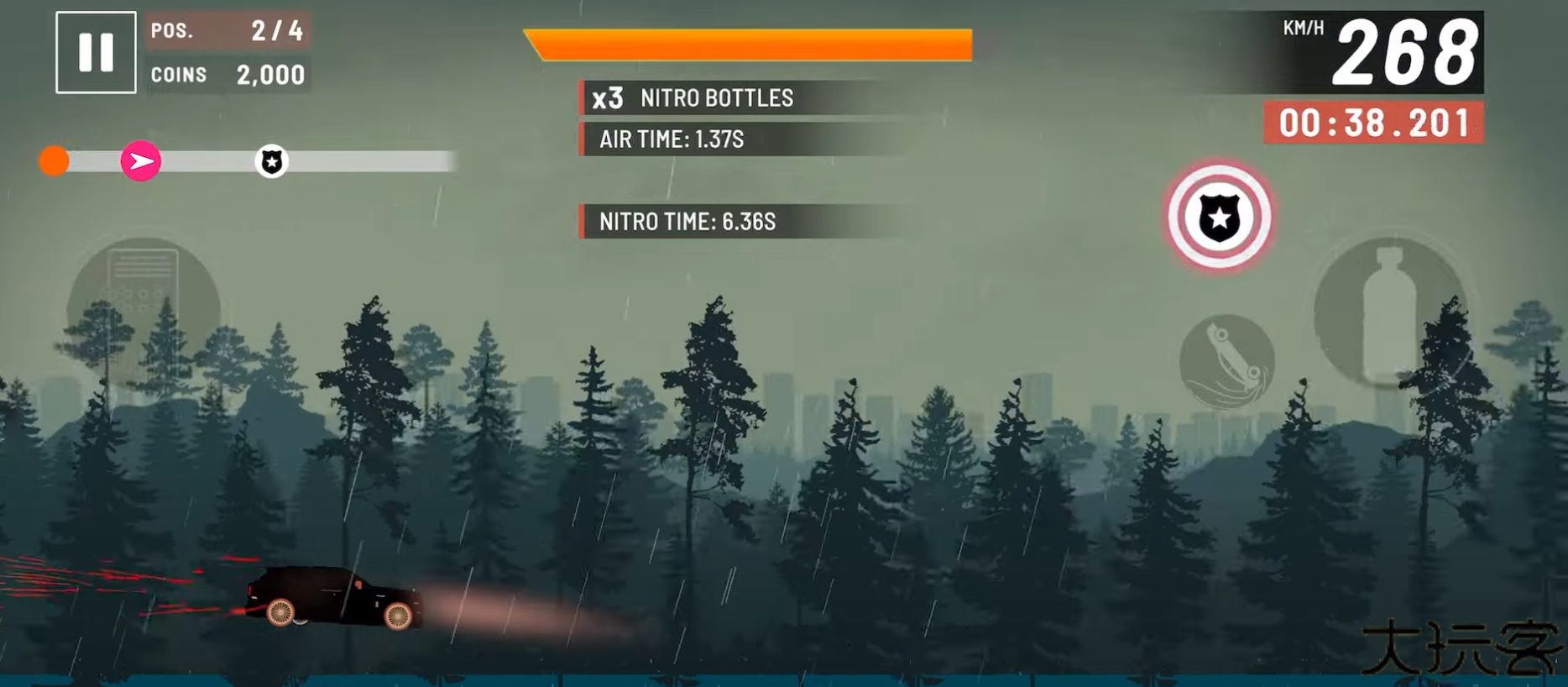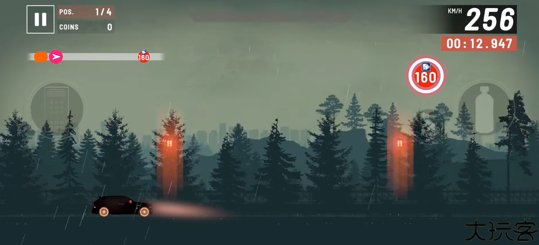 2、游戏操作很简单,屏幕左侧是控制前进和刹车,右侧是加速道具,右上角则可以看自己行驶的距离。