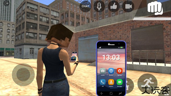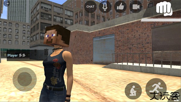 4、玩家进入游戏里,可以先点击【Chat】以进行对话,屏幕左边的摇杆可以控制角色移动,右边按键则能让角色蹲下和跳跃。
