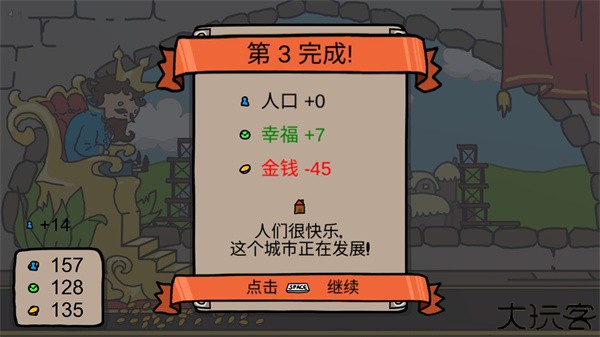 11、玩家可以看到统计,人民的幸福增加了就行,然后点击继续挑战。