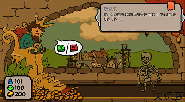 骷髅一般问都是关于冒险的问题,很多时候可以选择跳过,但其实小伙伴们也可以选择给予他金币换取一段时期的安全或者赌它给玩家的是好东西。