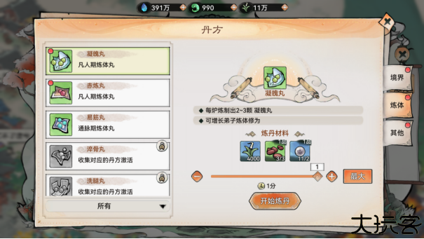 使用炼体丸如凝魄丸、赤炼丸、易筋丸等提升经验,高级丹丸需宗门等级及丹方解锁。