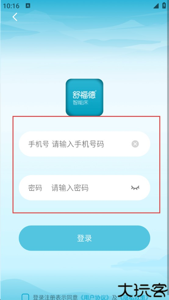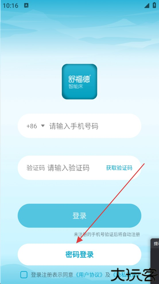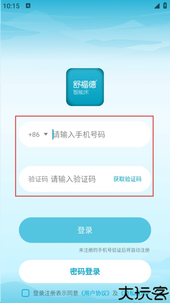 1、进入舒福德智能床睡眠管理里有着手机号登录页,可以去输入手机号和验证码。