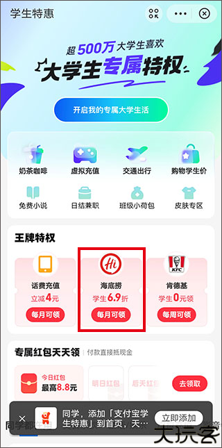2、进入学生优惠页面,找到海底捞学生折扣优惠,点击领取。
