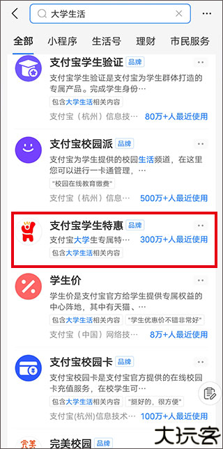 1、打开支付宝,在上方搜索栏搜索大学生活,就可以查找到支付宝学生优惠。